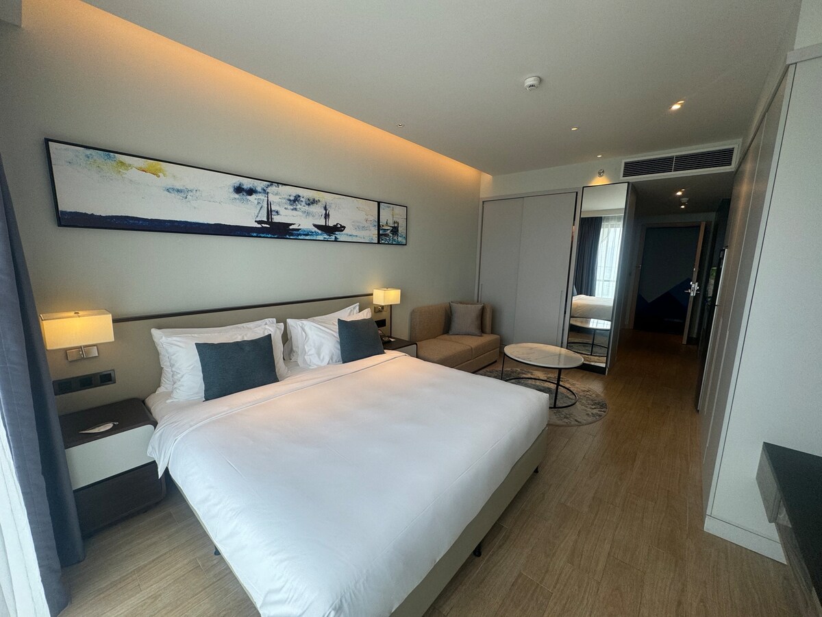 Ang pagpasok sa kuwarto ay isang lugar na parehong komportable at maaliwalas at marangyang interior, eleganteng natapos na sahig na gawa sa kahoy, modernong banyo,.. matugunan ang pamantayan ng pagbuo ng isang 5 - star hotel ay magbibigay sa iyo ng perpektong espasyo ng resort at mga amenidad na may tanawin ng bay * Available ang serbisyo sa paglilipat ng airport (may bayad)