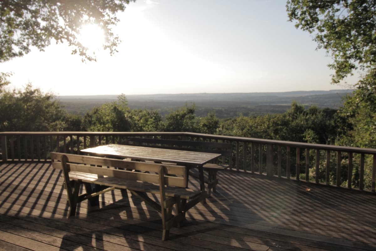 Ginawa ang aming magandang treehouse nang may lubos na paggalang sa nakapaligid na kalikasan, kung saan matatanaw ang isang magandang lawa at may malaking pribadong espasyo sa labas. Itinayo gamit ang magagandang materyales, ang labas ay ginawa gamit ang mga lumang pine board na nagmumula sa mga lumang dismantled chalet sa Pyrenees. Ang bubong ay gawa sa mga cedar shingles na nagbibigay ng isang napaka - natural na hitsura sa pamamagitan ng ganap na pagsasama - sama sa magandang kalikasan na ito. Ang aming cute na cabin ay maaaring tumanggap ng dalawang tao Mamamalagi ka sa isang malaking 160 cm na higaan na talagang nakakaengganyo at sobrang komportable. Pagdating mo sa higaan, may mga sapin, duvet, kumot, at unan. Isang toilet siyempre tuyo, isang maliit na lababo ang nagbibigay ng inuming tubig sa temperatura ng kuwarto. Ang mga tuwalya sa banyo ay nasa iyong pagtatapon. Sa taglamig, maaari mong matamasa ang kaaya - aya at banayad na init salamat sa maliit na kalan na nagsusunog ng kahoy na pumutok sa paanan ng higaan. Nasa lokasyon ang lahat, ang maliit na kahoy na panggatong, ang mga troso, ang mga ilaw ng apoy, ang mga tugma... Ang kuryente ay ibinibigay ng mga solar panel na naka - install sa property para sa pag - iilaw at pagsingil ng mga mobile phone. Available ang mga inumin sa maliit na refrigerator nang walang dagdag na bayarin. Sa umaga bandang 8am, naghahain ng masasarap na almusal sa terrace. Maingat kaming dumarating para hindi ka gisingin pero huwag ipagpaliban ang pag - aari ng mga ito dahil naroon ang mga ardilya at hindi sila dapat umalis dala ang mga pastry;-) Sa panahon ng tag - init, maaari mong tamasahin ang magandang terrace na tinatanaw ang lawa kung saan ang pato, mga heron, mga pagong sa tubig at iba pang mga ibon ng tubig ay kumukuskos ng balikat at kumain ng almusal sa gitna ng magandang kalikasan na ito. Kung gusto mong masiyahan sa nightlife, inirerekomenda na iwanan ang kurtina nang bukas para humanga sa maraming maliliit na hayop na darating para kumain sa maliit na feeder sa bintana na 50 cm ang layo sa iyo, darating ang mga ardilya sa sandaling sumikat ang araw at ang mga ibon sa buong araw. Available ang listahan ng ilang restawran sa nayon kung gusto mong kumain sa gabi pati na rin ang mga litrato na may mga pangalan ng maliliit na hayop na kadalasang nakatagpo sa kakahuyan. Sa madaling salita, ginagawa ang lahat para magkaroon ka ng magandang karanasan at matamis na gabi sa gitna ng kalikasan.