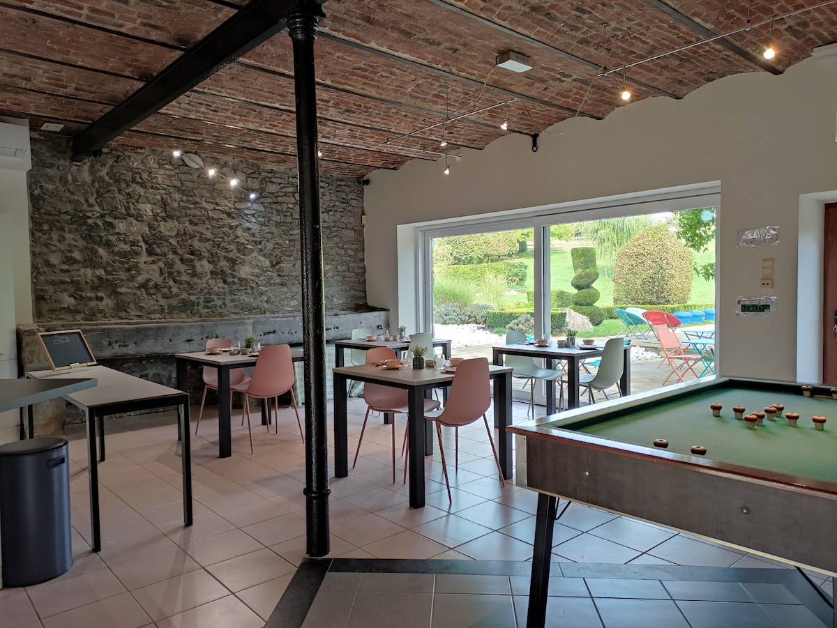 50m² Deluxe Suite with private terrace, King Size bed, living room, Smart TV, elegant bathroom, and fully equipped shared kitchen. Autonomous access, Wi-Fi, and secure private parking. Pool, sauna, breakfast, and bike rental available on request. Located 10 minutes from Villers-la-Ville and 20 minutes from Charleroi airport. Ideal for a comfortable, relaxing, or business stay.
