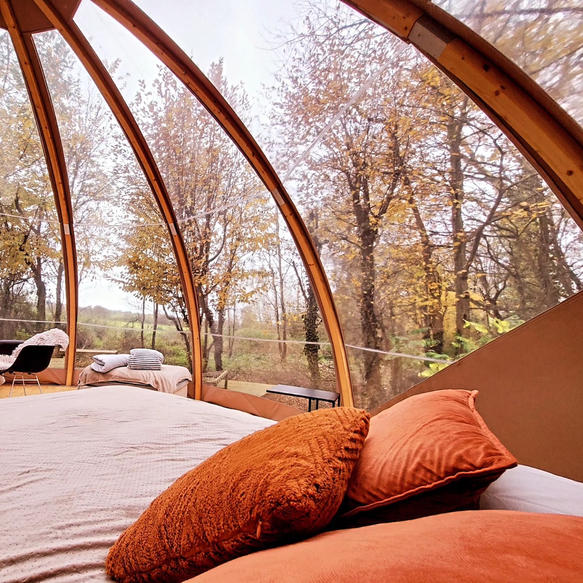 Dome na may suite para sa almusal sa gitna ng kalikasan. May outdoor area rin para makapagpahinga. Access sa jacuzzi na may organic climatic veranda at pribadong sauna. Magche‑check in nang 5:00 PM at magche‑check out nang tanghali. Ang pag - ibig Pinapainit ang Dome sa taglamig at nilalagyan ng air‑condition sa tag‑araw. Microwave , coffee and tea machine, refrigerator , shower gel at care cream toiletry, tuwalya , robe at sandalettes . Makakatulog ng 2 hanggang 5 tao Mga opsyonal na masahe, facial, manicure at pedicure, pag - aalis ng buhok.