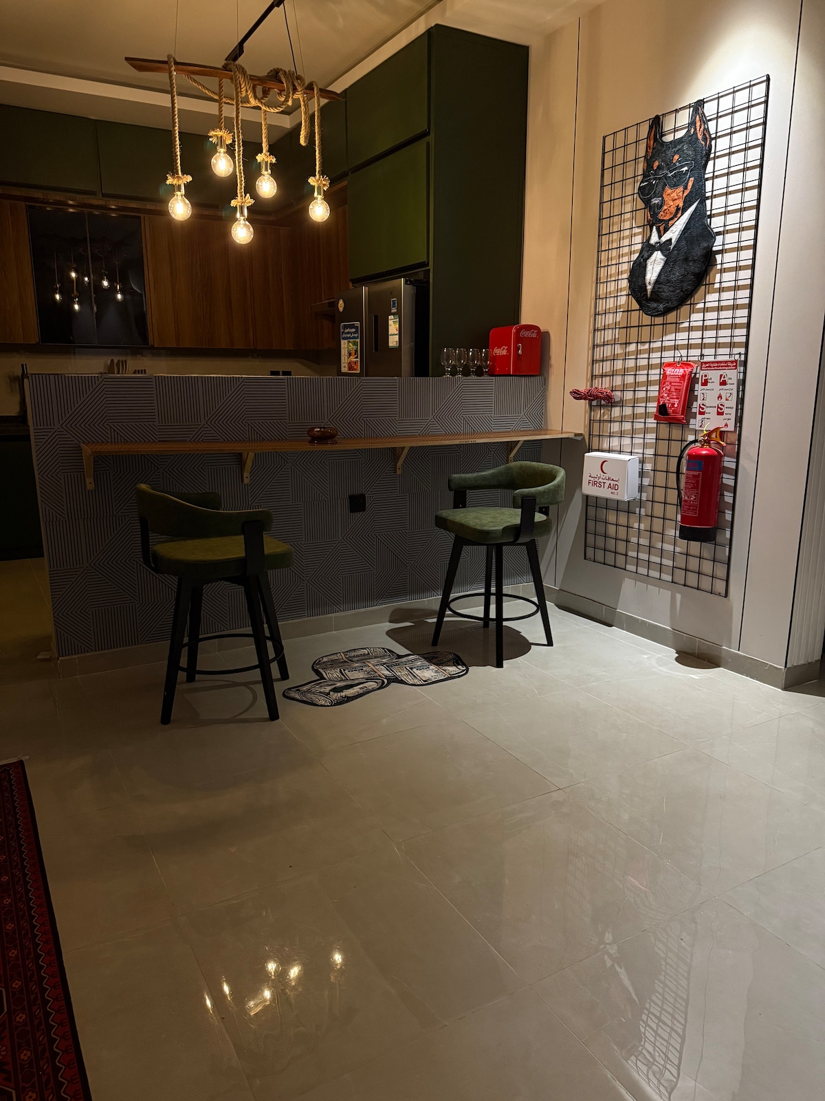 Pinagsasama ng studio ang lahat ng serbisyo sa ilalim ng isang bubong na nagtatampok ng malalaking bintana mula sa two - way at ganap na matalinong smart na kurtina, smart entry, smart screen, smart lighting switch, at lahat ng serbisyo sa apartment na gumagana sa pamamagitan ng audio sa serbisyo ng Alexa - Mga high - end na muwebles na may moderno at eksklusibong espesyal na T Home - Komportableng kutson na may stive hotel mattress - Komportableng sofa at nakakarelaks na upuan mula sa kawali Home - 75 pulgada na smart display - iPad voice control tablet Alexa - Microwave - Refrigerator - Iron na may ironing table - Coffee Corner - Mga Single Use na Tuwalya - Isthwar - Shower Gel at Shampoo