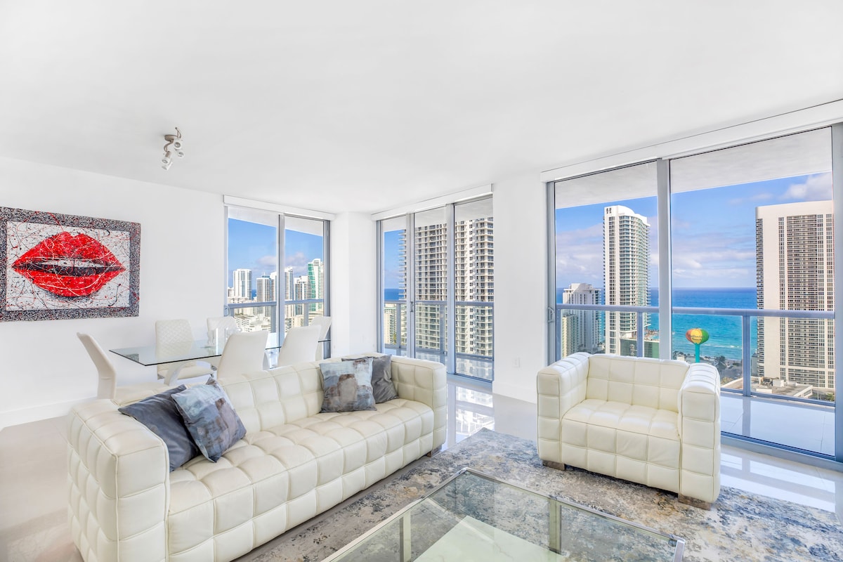 Masiyahan sa hindi malilimutang bakasyunan sa sopistikadong 1 bed/1 bath haven na ito sa Hallandale Beach. Matatagpuan sa prestihiyosong Lyfe Beach Resort sa Hollywood, nagbibigay ito ng mga nakamamanghang tanawin ng Karagatang Atlantiko. Ang makinis na kusina ay may mga premium na kasangkapan, kabilang ang isang Subzero refrigerator, oven, dishwasher, at Ninja Airfyer. Kasama sa mga karagdagang amenidad ang in - unit washer at dryer, libreng WiFi, at serbisyo sa beach na may dalawang lounge chair at payong para sa perpektong araw sa beach.