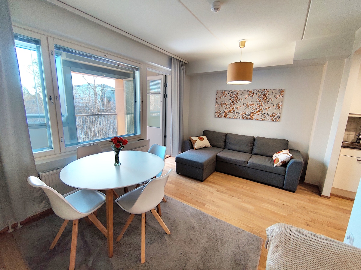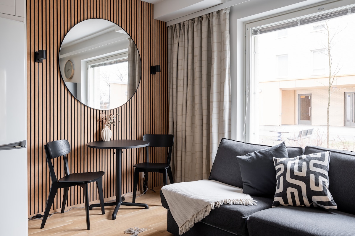 Take it easy at this unique getaway and enjoy your stay in this fairly new 34 m2 condo & studio (+13 m2 balcony). Calm neighborhood with excellent transportation connections makes accommodation comfortable and makes you feel like home. The bus stops are located right near near the apartment and the metro station is only a 5-minute walk away (450 meters from the apartment) which takes you to the city center within 12 minutes.