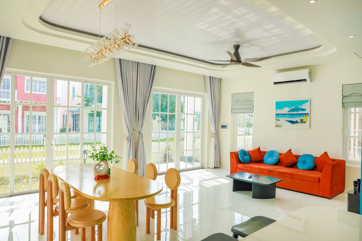 - Single villa na matatagpuan sa Novaworld Phan Thiet na may lawak na 200m2. - May 1 kusina, 2 higaan, 2 kuwarto, 3 banyo na may 2 dagdag na kutson (maaaring tumanggap ng 8 may sapat na gulang at 2 batang wala pang 10 taong gulang). - Madaling puntahan ang mga amenidad tulad ng infinity pool, Bikini Beach, Circus Land amusement park, Wonderland water park. - Libreng pagluluto, BBQ sa labas. - Available ang mga serbisyo sa paglilinis, pag - upa ng speaker, at mga serbisyo sa pagbili.