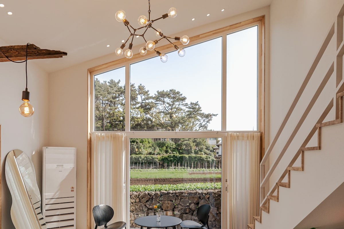 * Kinakailangan bago mag - book - Pangunahing pagpapatuloy: Tanging ang → pangunahing bahay para sa 1 -5 tao (2Br +2Bathroom) - Bukas ang karagdagang → annex (kasama ang banyo) kapag nagbu - book para sa 6 o higit pang tao - Kung gusto mong gamitin ang annex, magpareserba para sa 6 o higit pang tao. ※ Panatilihin ang karaniwang bilang ng mga tao para sa maayos na operasyon. Idinisenyo ito bilang motif ng arkitektura para sa 'pagiging isa sa kalikasan' at pabilog na hugis para makatakas sa nakabalangkas na balangkas. At para maramdaman ang pagrerelaks ng mundo habang komportableng nakaupo, pinalamutian namin ang karamihan ng tuluyan bilang silid - upuan. Nakikibahagi si Lasson sa proseso ng disenyo para mabuhay ang pamilya. Ito ay isang bahay na maingat na itinayo. Sa nakalipas na ilang taon, ito ay isang panahon kung saan maaari kong ganap na maramdaman ang kalikasan ng Jeju. Gusto naming ibahagi ang kaginhawaan at kagandahan ng Jeju ngayon. Magkaroon ng komportableng pamamalagi. {Lassong}