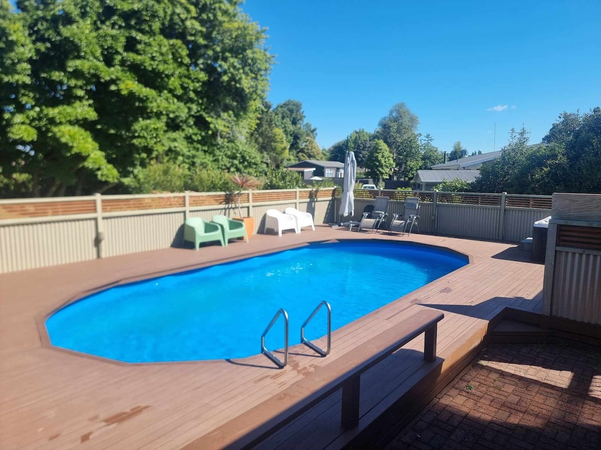 Maligayang pagdating sa aming maluwag at airconditioned na pool side studio. Ang 55sqm studio unit ay hiwalay sa aming bahay ng pamilya at tinatanaw ang aming resort style pool. Nakatira kami sa isang 2 1/2 acre lifestyle block sa labas lamang ng Hamilton at madaling access sa Cambridge at Lake Karapiro. Ang Hobbiton, Waitomo Caves at Rotorua ay isang kasiya - siyang day trip mula sa aming lugar. Available ang Unlimited Wifi at multi channel na 'Freeview' TV. Nasa pool ang aming pampamilyang tuluyan at masaya kaming tumulong sa anumang paraan na magagawa namin.