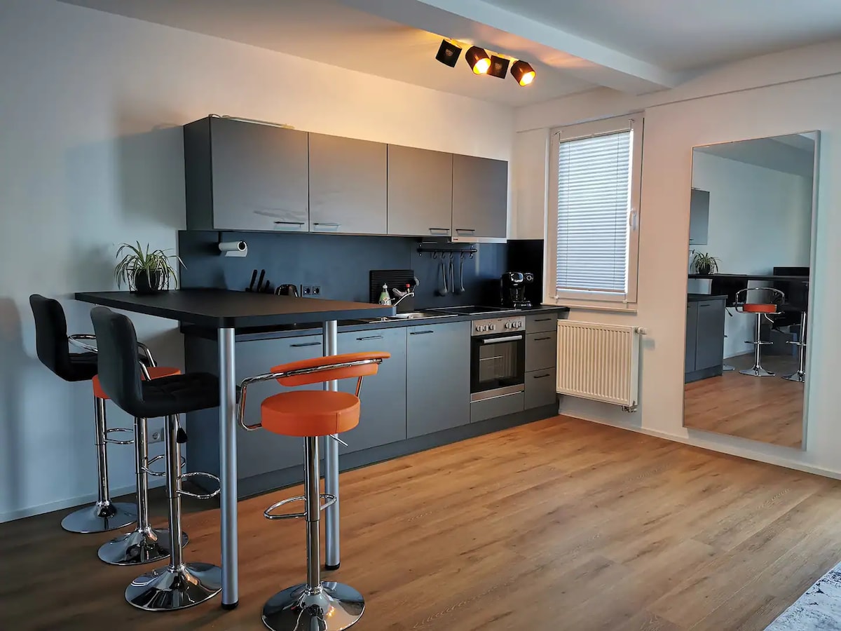 5 pers. apartment sa kanayunan, malaki at moderno, 20 min. na trade fair
