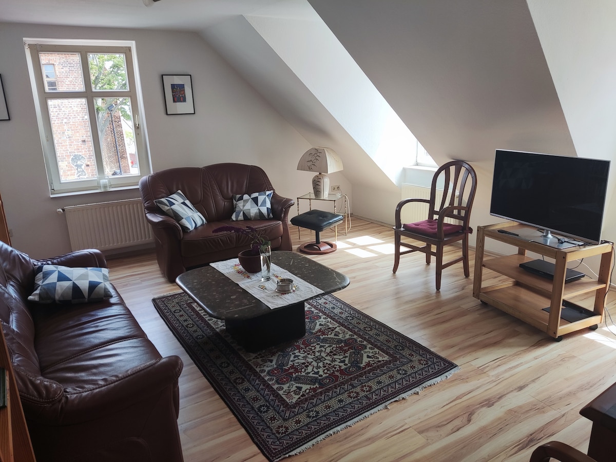 Maaliwalas na apartment (humigit‑kumulang 75 o 90 m²) sa nakalistang bahay na may kalahating kahoy. Malawak at kumpletong kusina na may tiled stove, sala na may sofa bed, reading corner at tiled stove, 1 kuwarto (para sa 1–2 tao) o 2 kuwarto (para sa 3 tao pataas), na may double bed ang bawat isa, at banyong may shower at sauna. May libreng internet sa buong apartment. Central heating sa lahat ng kuwarto. Pribadong hardin. Available nang may dagdag na halaga: Paglilipat mula sa Bhf, shoppingservice, mga paupahang bisikleta, canoe, gym