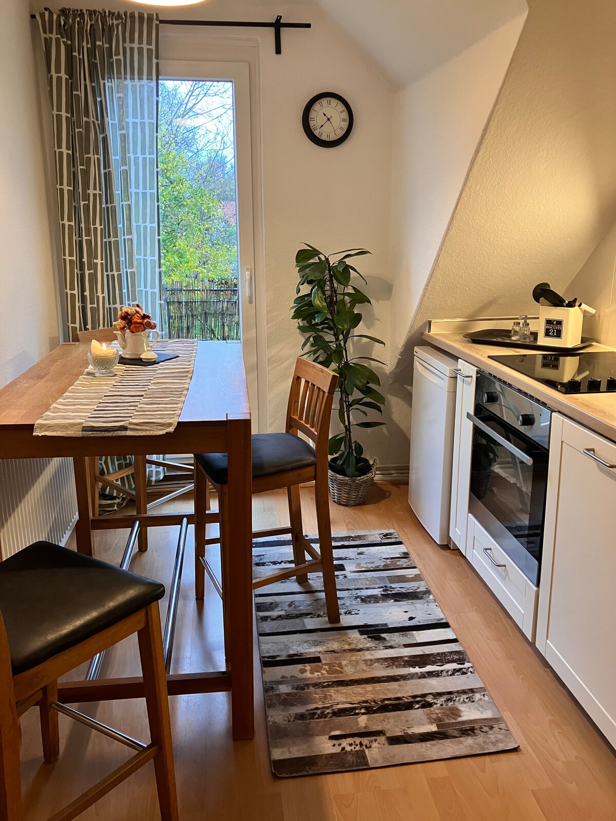 Unsere Gäste haben die obere Etage mit 90 qm für sich allein. Über eine kleine zweite Haustür gelangt man nach oben. Es gibt dort eine Wohnküche mit einem Einzelbett, ein großes Schlafzimmer mit 160 cm Doppelbett, ein weiteres Schlafzimmer mit 140 cm Doppelbett, das Kaminzimmer, einen kleinen Balkon und ein Bad mit Wanne und Dusche. Im EG wohne ich mit meinem Freund und unseren 3 KATZEN, ich kann nicht ausschließen, dass die 3 Fellbewohner Euch mal besuchen, falls ihr die Tür offen habt.
