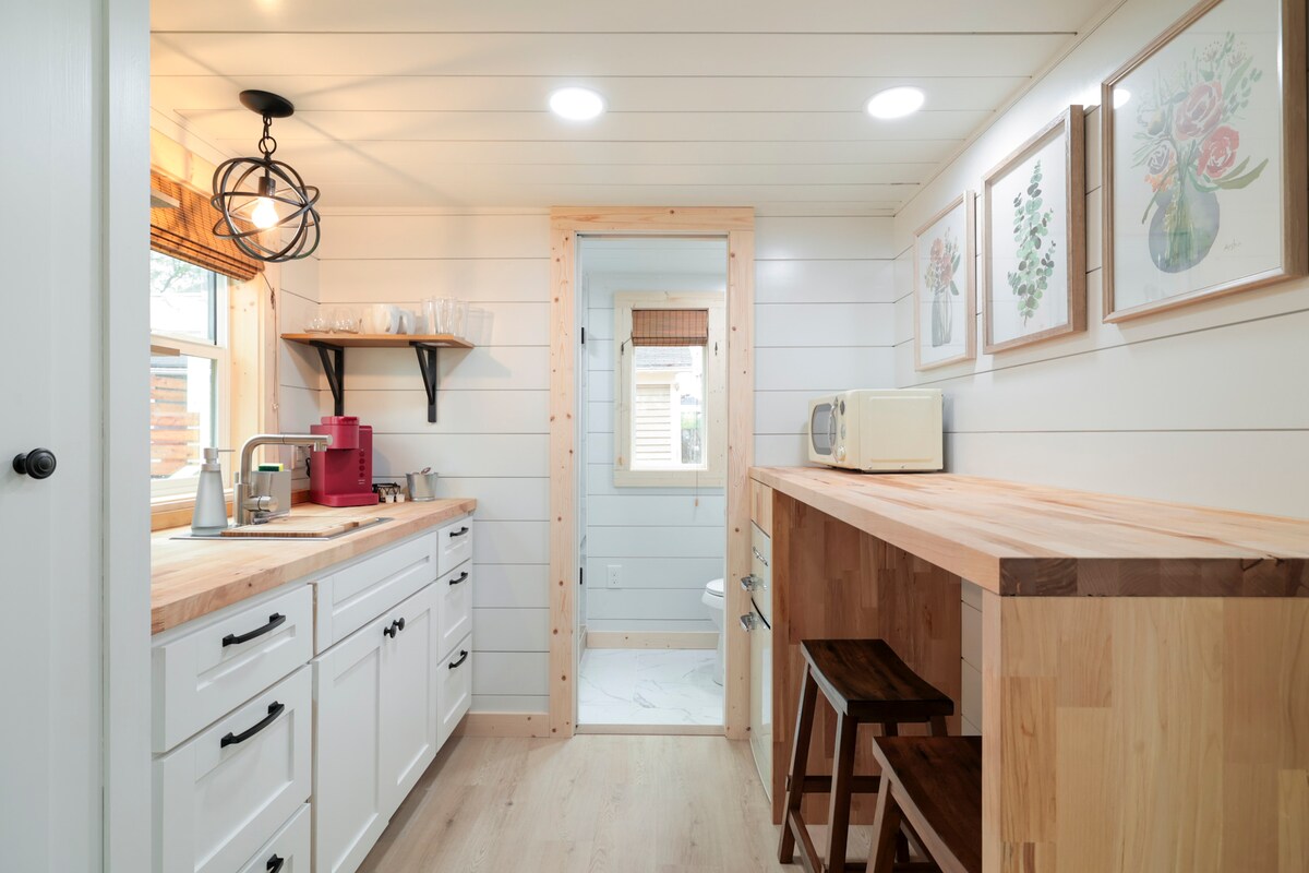 Welcome sa The Garage-- Isang natatanging, sobrang pribado, at sobrang malawak na munting bahay na parang kamalig! Sa 400 Sf, makakakuha ka ng parehong kaginhawaan at mga amenidad na gagawin mo mula sa isang malaking tahanan habang sinasabi sa iyong mga kaibigan na namalagi ka sa isang maliit na isa! Dito para sa trabaho? 3 bloke lang mula sa I -45 at SOBRANG mabilis na wifi ang nagbibigay sa iyo ng access sa mga interweb o sa interstate para makapagtrabaho ka nang mahusay. Narito para MAIWASAN ANG trabaho? Ako rin! Mag-enjoy sa romantikong paglubog ng araw mula sa aming maaliwalas na patyo o mag-enjoy sa mainit na tub!
