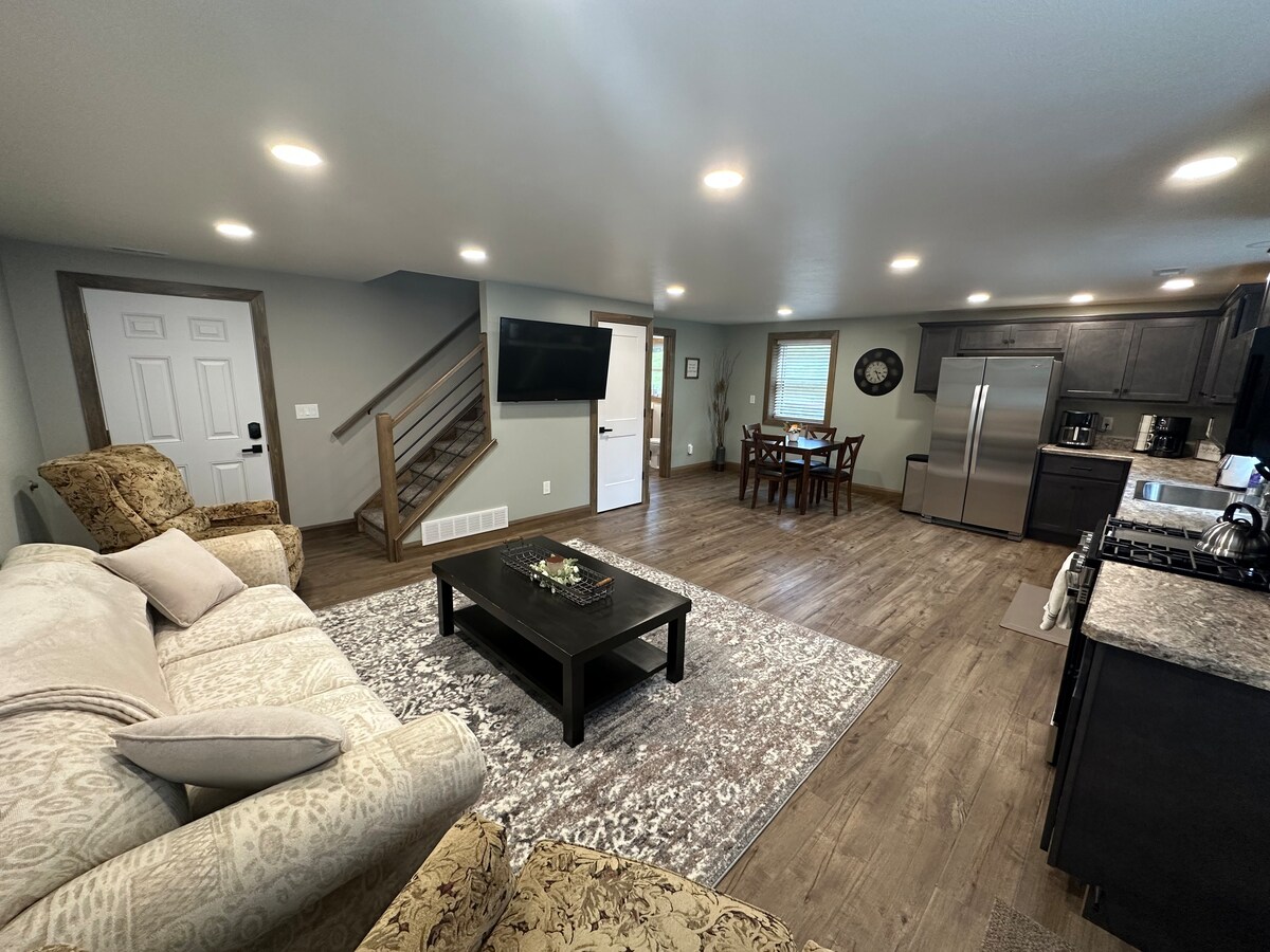 The apartment is above a detached garage. The spacious floor plan is modern and fresh, on-site laundry, a full kitchen, walk-in closet and large private bathroom, this apartment feels just like home. Long term lease is available for a discounted rate. The apartment is located on a busy street (“busy” for a small town) you will hear cars and motorcycles drive by. Please take this into consideration when booking.