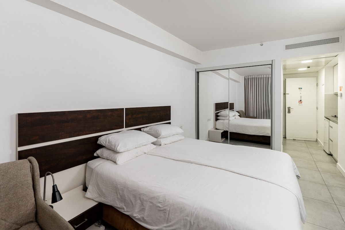 Ce studio moderne à Netanya vous offre une vue mer époustouflante et un emplacement idéal à 3 min à pied du Kikar, avec accès direct à la plage. Parfait pour un séjour à deux ou en famille avec un enfant. Wi-Fi, climatisation, cuisine équipée, machine à laver. Ambiance cosy et calme pour un séjour reposant. dans ce logement paisible et central.