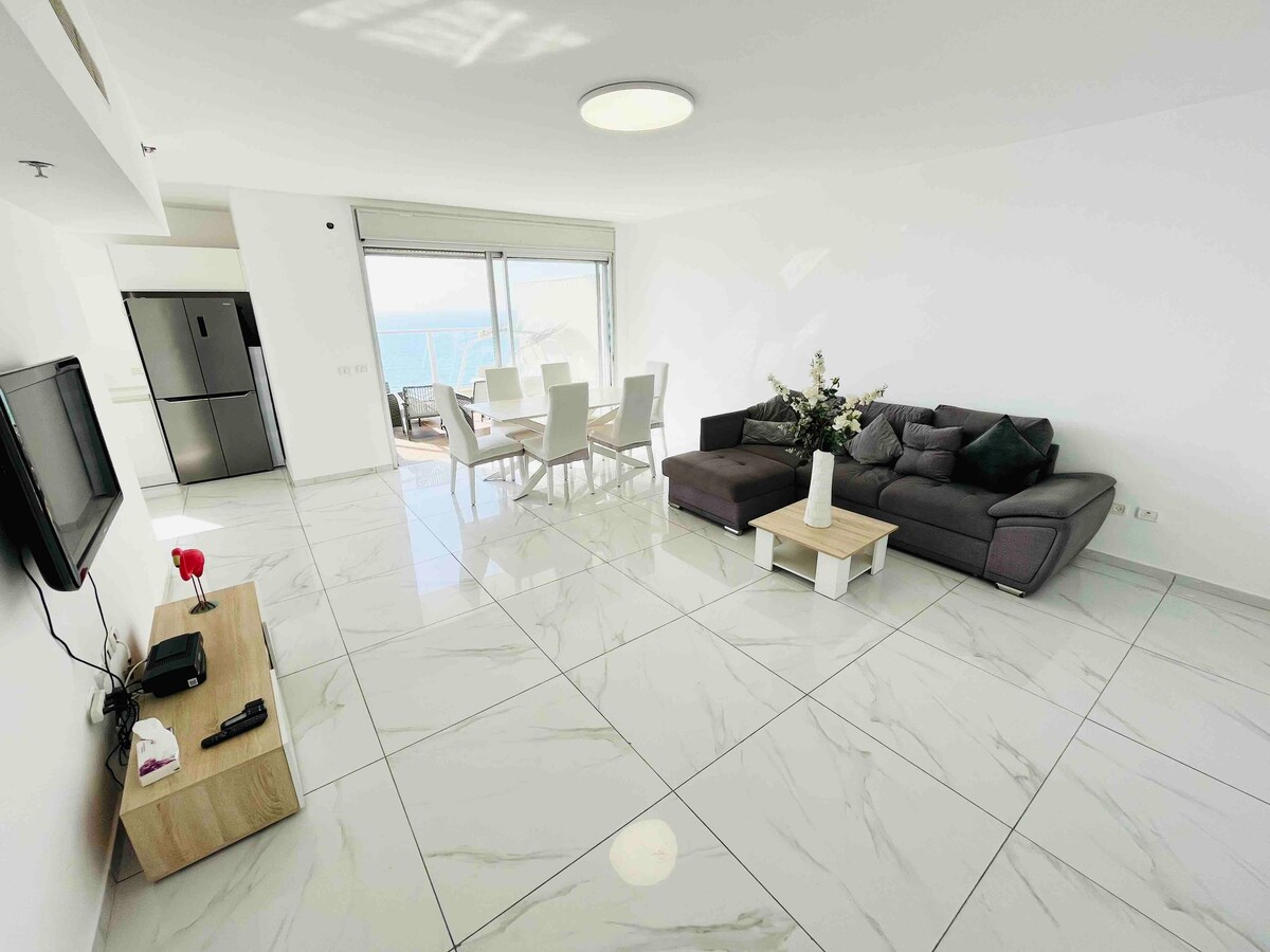 🏖️ Pambihirang apartment na may tanawin ng dagat sa Ir Yamim, Netanya 🌅 Maligayang pagdating sa kamangha - manghang apartment na ito sa isang marangyang tirahan sa Ir Yamim, isa sa mga pinakamadalas hanapin na lugar sa Netanya. Masiyahan sa mga nakamamanghang tanawin ng dagat, 5 minutong lakad lang ang layo mula sa beach para sa mga hindi malilimutang nakakarelaks na sandali. 1 minutong lakad ang layo mula sa Piano Mall na may mga tindahan, cafe, at restawran. Ang perpektong lokasyon para sa pagsasama - sama ng kaginhawaan, paglilibang at katamaran.