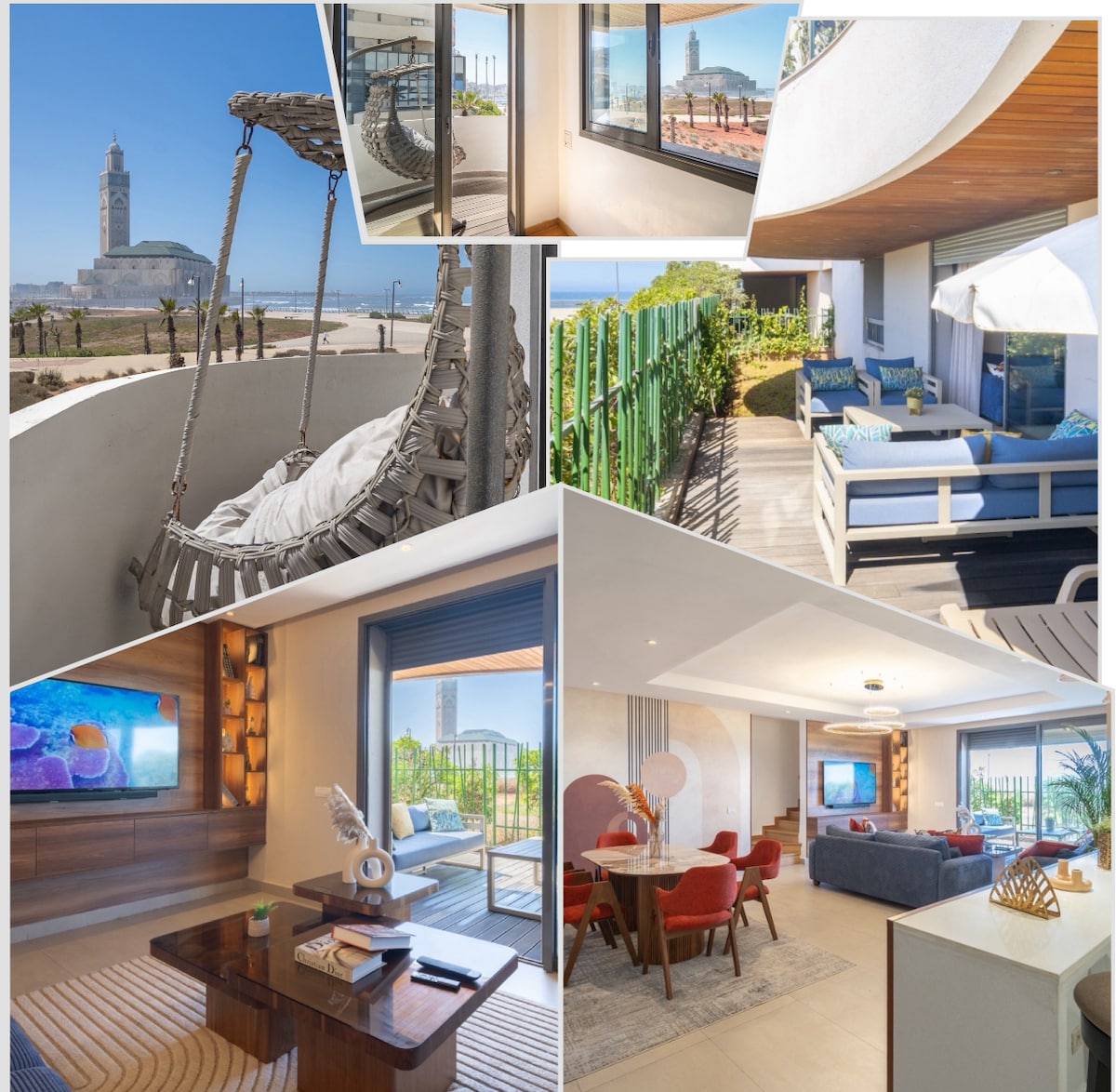 Mamamalagi ka man para sa isang bakasyon ng pamilya, business trip o para lang sa isang mabilis na pamamalagi, lokasyon sa isang tahimik na kapitbahayan at pakiramdam tulad ng Home! Isang maikling lakad papunta sa sikat na Hassan II mosque, malapit sa mga nangungunang moroccan restaurant at merkado. Tumuklas ng makukulay na sining at maraming lugar para makapagpahinga, at mag - enjoy sa paghahanda ng mga pagkain sa kusina na kumpleto ang kagamitan at tikman ang iyong kape sa swing front sea at moske na Hassan II Ang property na ito ay may Anti - party na pagbabawal, o anumang uri ng mga kaganapan, Talagang walang paninigarilyo sa loob