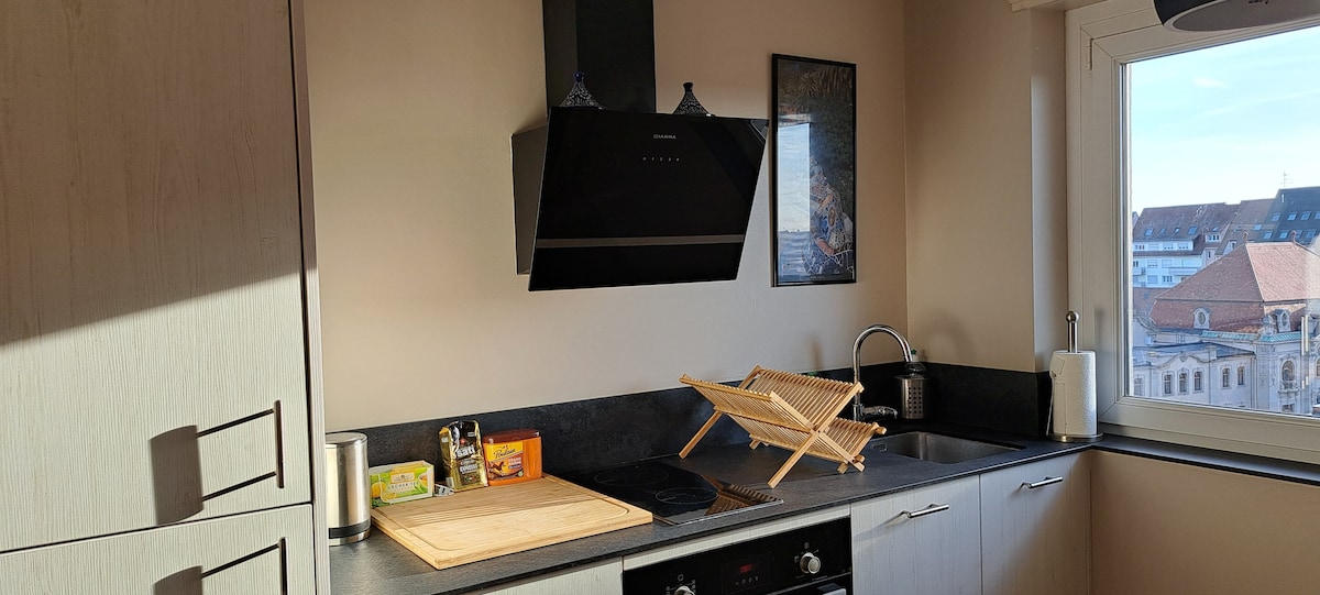 Matatagpuan ang tuluyan mo sa gilid ng medyebal na lungsod at wala pang 300 metro ang layo nito sa Collegiate Church, mga museo, at mga sinehan. Nasa ika-6 at pinakamataas na palapag ang studio. Maliwanag ito at matatanaw mula rito ang mga bubong, at sa malayo, ang mga bundok ng “Black Forest” at Vosges. 140 cm na higaan, banyo, kusina, at sala. Pribadong pasukan, elevator. May koneksyon sa urban na BUS at papunta sa Freiburg im Breisgau sa paanan ng gusali at 1 km ang layo ang istasyon ng tren ng SNCF, may tren papuntang Strasbourg at Basel kada 30 minuto