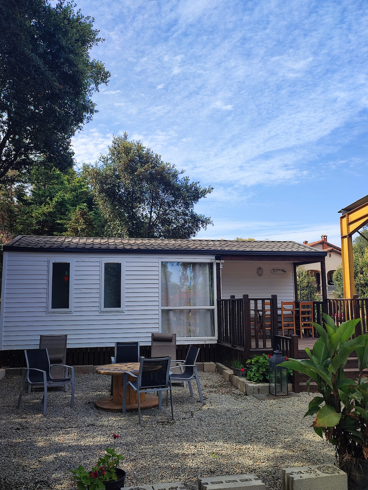 mobile home na matatagpuan sa isang property na 2000m2 na may kakahuyan, at ligtas. Kabilang dito ang 1 double bedroom at 1 silid - tulugan na may 2 single bed, sala na may TV, 1 kusina na may microwave,coffee maker, takure,toaster,washing machine. 1 shower room at hiwalay na toilet. Naka - air condition ito. Mula sa magandang may bulaklak na terrace kung saan may sala , may access ang isa sa hardin na may mesa ,upuan, at barbecue. Nagbibigay kami ng mga linen at tuwalya. Isang tahimik at mabulaklak na setting na 2 km mula sa isang mabuhanging beach.
