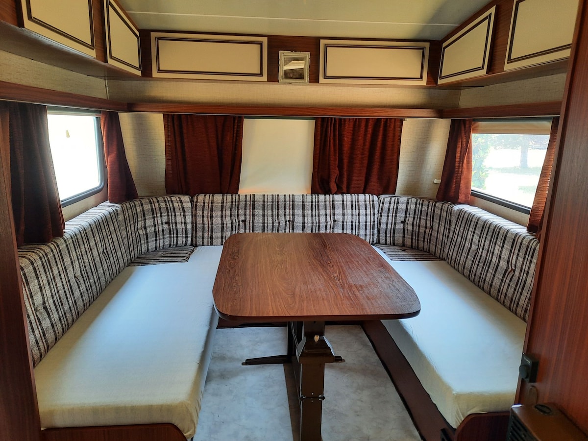 My vintage caravan year 69 for which I redone the curtains, varnished the furniture changes the bedding serves as a bedroom the outdoor terrace with covered floor kitchenette, shower sink wc.. you have to bring sheets and towels.. of course it's still a cabin or you can come to 2 adults and 2 children or 3 adults..so for the price with kitchen and bathroom included.. you cannot have the standard of an airbnb room in my house