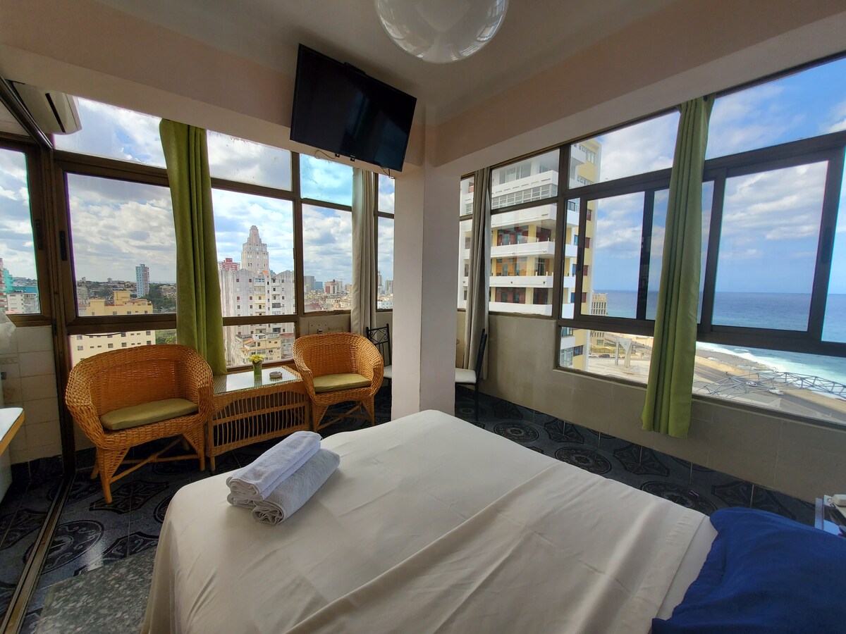 Ang pinakamagandang tanawin ng lungsod mula sa isang marangyang penthouse na matatagpuan sa ibabaw lamang ng dagat, na may mga serbisyo ng concierge at permanenteng kuwarto kabilang ang pang - araw - araw na paglilinis. Ganap na kaginhawaan na may kalidad na serbisyo na mas mataas kaysa sa anumang hotel sa lungsod. Mga reserbasyon sa restawran, kaayusan para sa pag - pick up sa mga paliparan, pamamasyal sa Viñales Valley at Colonial Havana tours; mga almusal, hapunan at mapa ng lungsod. Palagi kaming nasa alerto para sa anumang kahilingan nang may layuning gawing talagang kaaya - aya at ligtas ang iyong pamamalagi.