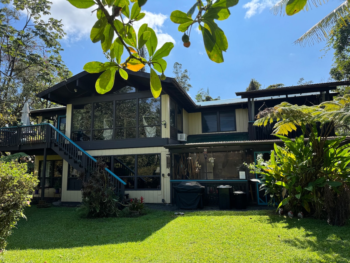 Aloha, Jungle Bungalow is a 2nd floor whole house rental - NO STAIRS - EASY RAMP ACCESS - in a tropical paradise! 2 bedrooms w/king beds, storage, shower robe and more! Tingnan ang mga verdant na hardin ng Anthuriums, Lilly Pads, & Monstera - kumakanta ng mga palaka ng Coqui sa gabi, himig ng mga ibon w/ tahimik na umaga - kape sa SCREEN na lanai habang naglalakad ka nang direkta mula sa silid - tulugan ng kawayan at obserbahan ang kagubatan sa taas ng tree house. Volcano Nat. Park - 50 minuto. Pamimili/pagkain - 4 na milya. Fissure 8 - 2018 - 10 milya.