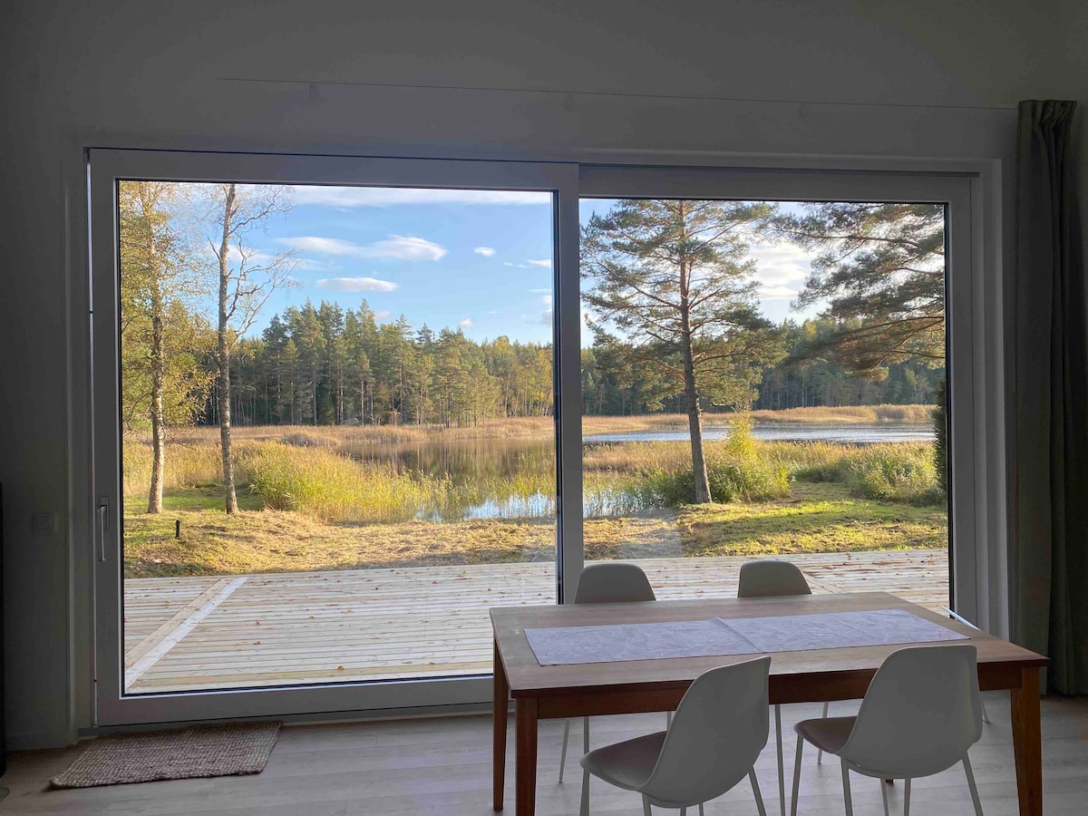 Magrelaks sa tahimik na tuluyan na ito at magtanaw sa lawa at kalikasan. Mamamalagi ka sa bagong single‑story villa na may malalaking bintana at malalaking sliding door na nakaharap sa lawa. May fireplace at underfloor heating sa buong bahay ang bahay. Ang bahay ay may 3 silid - tulugan at 1 kuwarto na may sofa bed. Buksan ang planong sala at kusina na may mga nakamamanghang tanawin. May terrace na humigit‑kumulang 75 m2 ang bahay, at bahagi nito ang maaliwalas na patyo sa ilalim ng bubong. Naroon ang mga Canadian at puwede kang maglangoy mula sa property. May magandang beach na 7 minuto ang layo.