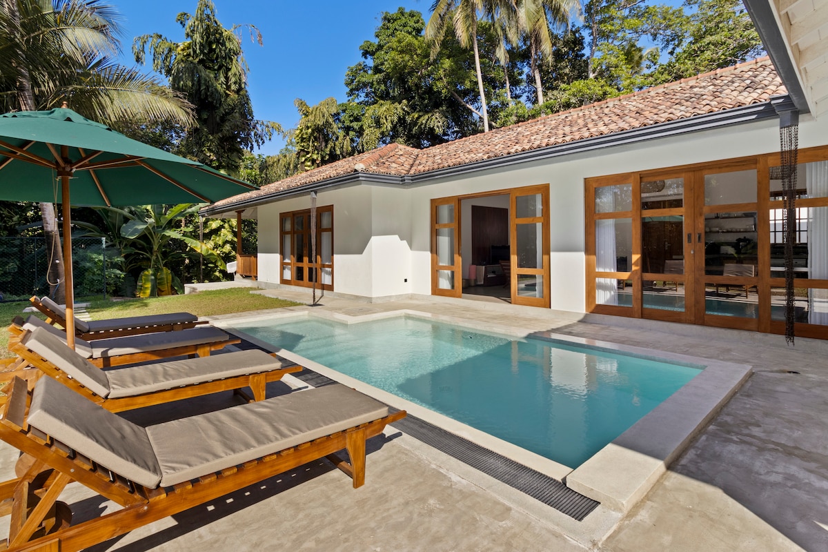 May bagong modernong villa sa tahimik na pribadong residensyal na lugar sa Mihiripena, 400 metro lang ang layo mula sa beach ng Dalawella. Nagtatampok ang mga master bedroom ng mga full - wall na bintana na may mga tanawin ng kagubatan at mga tanawin ng pagsikat ng araw mula mismo sa iyong higaan. Ipinagmamalaki ng mga banyo ang mga ulan at natatanging hawakan. Nag - aalok ang Villa ng kusinang kumpleto sa kagamitan, lounge area na may TV at patyo sa labas na may dining area at lounger. Masisiyahan ang mga bisita sa pinaghahatiang access sa swimming pool (5x18m) at mga pasilidad ng BBQ.
