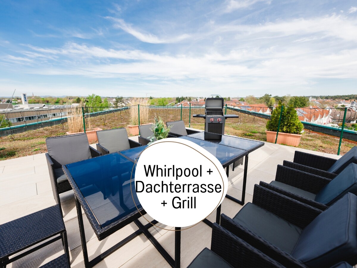 Maligayang Pagdating sa Home Living Suedwest ni Nathalie at sa marangyang penthouse na ito, na nag - aalok ng lahat ng kailangan mo para sa isang mahusay na panandaliang o pangmatagalang pamamalagi sa Karlsruhe: → 3 silid - tulugan na may 3 queen - size na higaan → 3 terrace sa rooftop → Jacuzzi, electric grill, at seating area → Panoramic view sa Karlsruhe, na umaabot sa France at sa Black Forest → Malaking Smart TV na may NETFLIX at Disney+ → 1 paradahan sa ilalim ng lupa (maximum na taas na 1.90m) → Kusina
