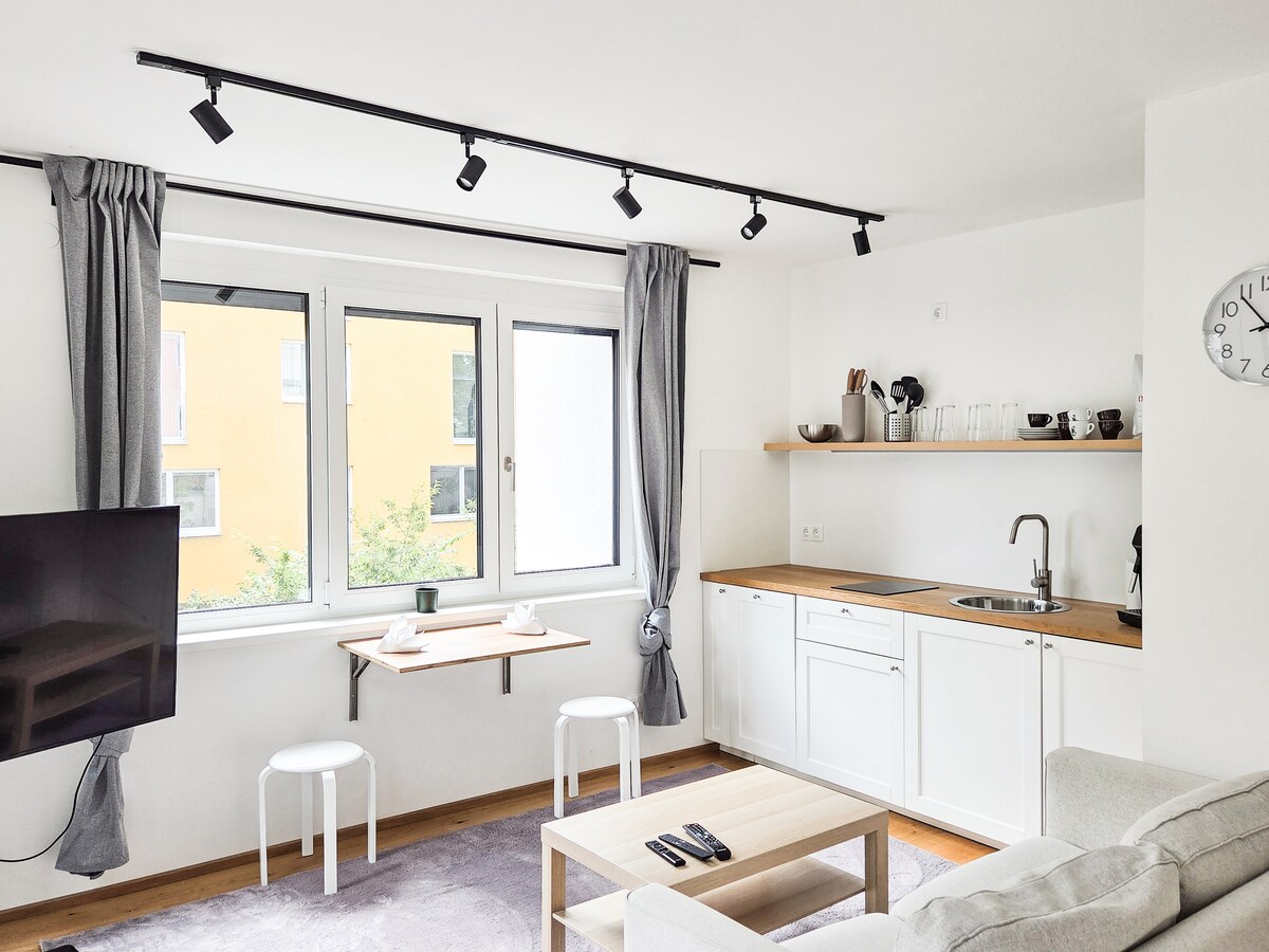 Modernong kaginhawa sa tahimik na lokasyon – ang pansamantalang tahanan mo sa Vienna. May kuwarto na may komportableng king‑size na higaan, maaliwalas na sala na may sofa, smart TV na may Netflix, at kumpletong kusina ang apartment. Mas komportable ang modernong banyong may walk-in shower. Pinakamagandang bahagi ang pribadong balkonahe na may tanawin ng tahimik na bakuran. Ilang minuto lang papunta sa subway at mga 10 minuto papunta sa sentro ng lungsod. Mainam para sa mga mag‑asawa, business traveler, at biyahe sa lungsod. May walang pakikipag‑ugnayan na sariling pag‑check in.