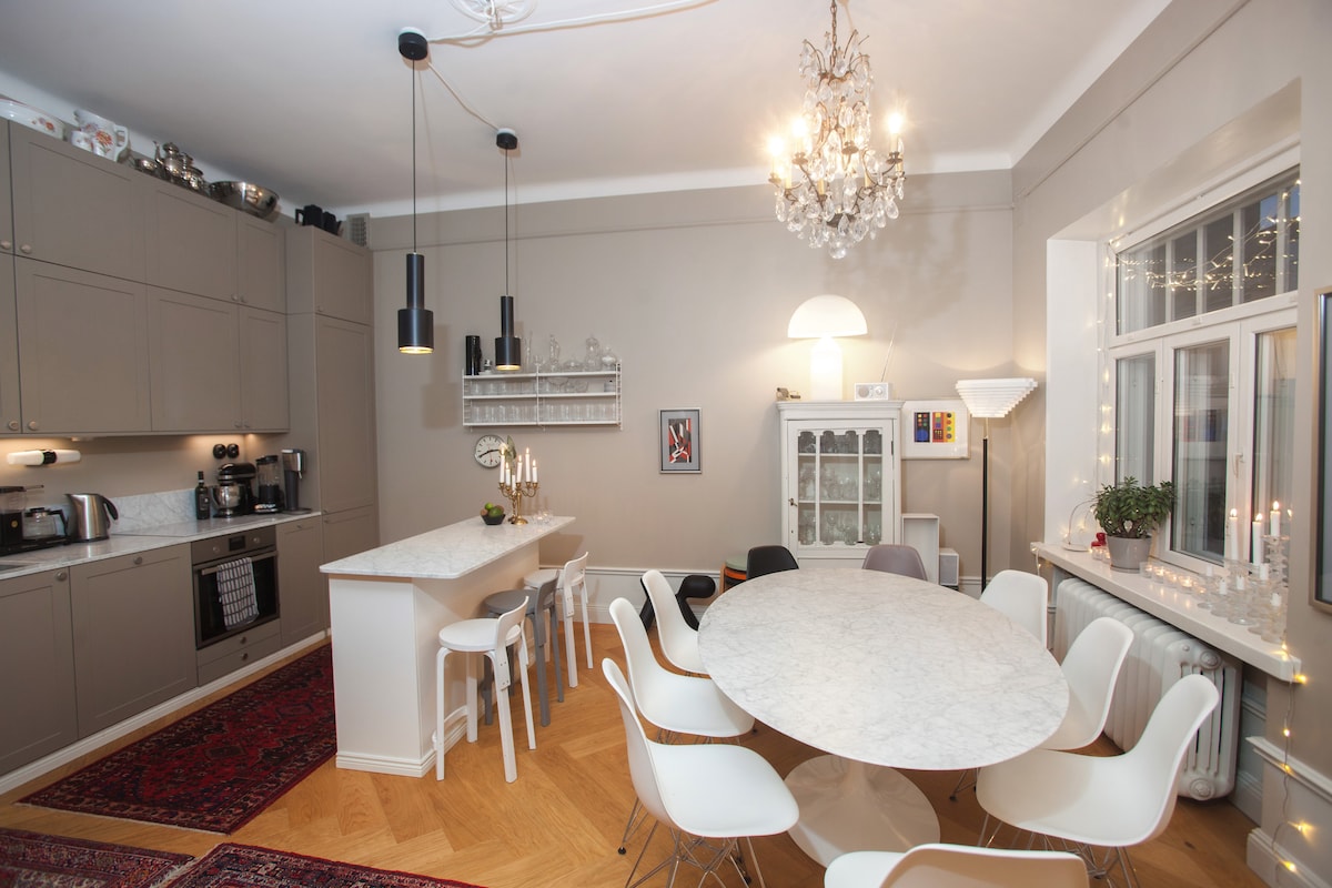 Kung mahilig ka sa magandang kapaligiran sa sentro ng lungsod, ang aking lugar ay tama lang para sa iyo. Lalo itong idinisenyo para sa mga diplomat o sinumang pupunta sa Helsinki sa mas mahabang panahon (mayroon ding availability na mas maiikling pamamalagi kapag bumibiyahe kami). Ang iyong tuluyan ay nasa tabi mismo ng Uspenski Cathedral at lahat ng pangunahing atraksyon ng lungsod. Narito ang Bridge of Love Locks, Helsinki Sky Wheel, Helsinki Fly Tour multi experience movie theater (flying experience over Helsinki), Allas Sea Pool Helsinki, Market Square, The Presidential Palace, City Hall, The Old Market Hall, Helsinki Cathedral, Helsinki City Museum at mga ferry sa fortress Suomenlinna (at Tallin, Estonia). Sa tabi mismo ng mga ito ang pangunahing shopping area at mga department store ng lungsod. Ang apartment na ito ay isang bagong (2019) pagkukumpuni/conversion sa lumang komersyal na gusali mula 1940's. Dinisenyo ng arkitekto na Toivo Paatela. Ang apartment ay may magagandang tanawin upang iparada na pinangalanan pagkatapos ng tagalikha ng Moomin character, Tove Jansson. Nilagyan ang kusina ng microwave oven, kalan/oven, toaster, dishwasher, at mga coffee maker. May hair dryer, washing machine, dryer ng damit, plantsa, at vacuum cleaner. Katajanokka ferry terminal (ferry sa Tallin) ay lamang ng isang 600 - meter lakad (o dalawang minuto na may tram #5) mula sa aking apartment. PAKITANDAAN! Maliit LANG ang mga kuwarto (8m2), at walang natural na liwanag ang ikalawang kuwarto, at napakatahimik nito, kaya mainam ito para sa mga pagtulog sa araw. MGA HIGAAN: Ang karaniwang set up ay isang queen bed sa parehong kuwarto. Puwede naming hatiin ang mga iyon sa mga pang - isahang higaan, kung kinakailangan
