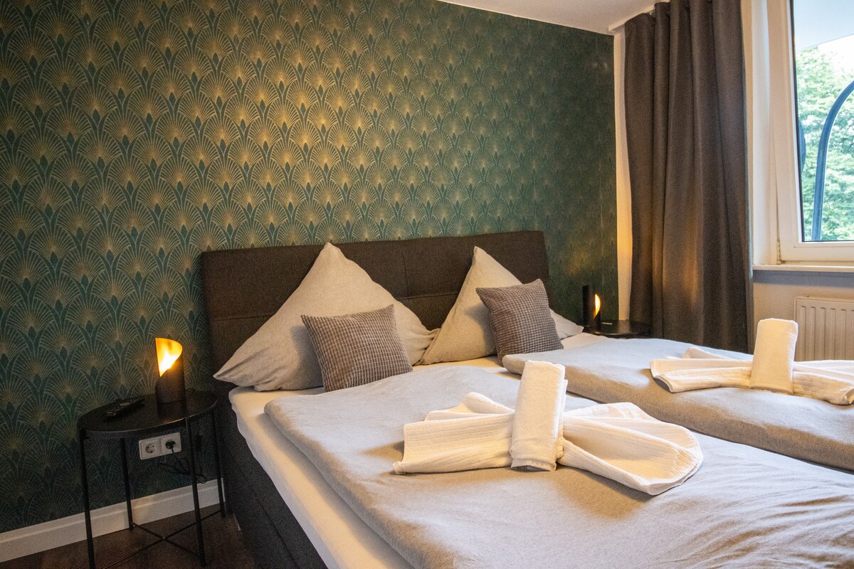 Frisch renovierte, 50 m² große Wohnung in ruhiger Lage – eine von fünf Unterkünften im Haus. Die Wohnung befindet sich im Erdgeschoß und ist ideal für bis zu 3 Gäste. Schlafzimmer mit zwei Einzelbetten, gemütliches Schlafsofa im Wohnbereich. Voll ausgestattete Küche mit Geschirrspüler, großer TV, kostenfreies WLAN. Waschmaschine/Trockner im Keller. U-Bahn in 8 Min., Bushaltestelle direkt vor der Tür. Viele kostenfreie Parkplätze. Kinderbett/Hochstuhl auf Anfrage. Kontaktloser Check-in.