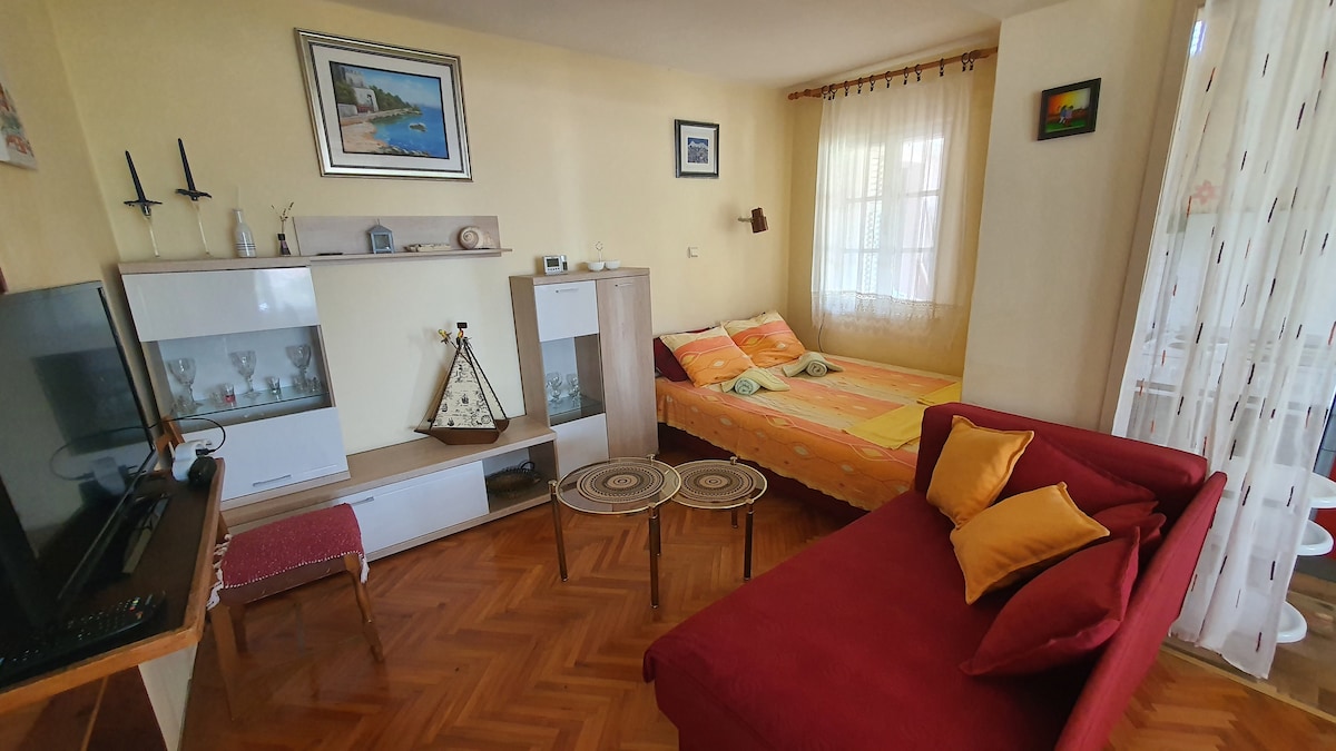 NOVO Minimum na pamamalagi sa loob ng 5 araw. Ang apartment na may entrance hall, banyo, DALAWANG SILID - TULUGAN, na may maluwang na pinagsamang sala na may silid - kainan at kusina, ay may sarili nitong sakop na terrace kung saan matatanaw ang dagat at mga seedling ng kiwi, saging, pekas palm, orange at lemon, sa hardin na may damuhan sa harap. Ang banal na sulok na may amoy ng lavender at rosemary ay gagawing kasiya - siya at hindi malilimutan ang iyong pamamalagi. LIBRENG tour ng bangka, beach sa dagat, para sa minutong pamamalagi na 7 araw. Nagsasagawa rin kami ng pangingisda sa bangka sa dagat