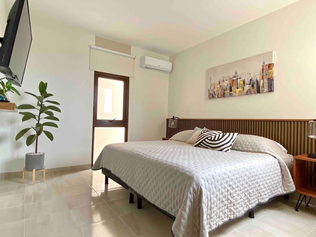 Ground floor apartment, mga naka - air condition na kuwarto na napapalibutan ng mga atraksyong panturista, restawran, shopping mall, museo, 3 minuto mula sa mga beach at 2.5 km mula sa Aquarium of Veracruz (Isang bloke mula sa Carnival at marathon) - Buhok at silid - kainan na may smart TV, kumpletong kusina kung saan matatanaw ang isang maliit na pribadong central garden. - Master bedroom na may king size na higaan, banyo, dressing room at smart TV. - Pangalawang camera na may double bed at aparador. - Garage para sa kotse na may de - kuryenteng pinto.