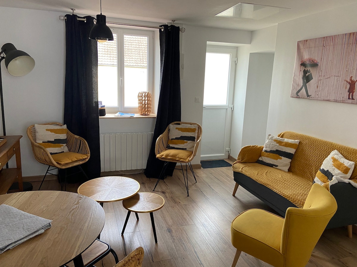 Medyo maaliwalas na 2 kuwarto at lahat ng kaginhawaan na may mga tanawin ng marina ng Ouistreham. 2 hakbang mula sa fish market, sa port at sa mga restawran nito. Direktang access sa daanan ng bisikleta na tumatakbo sa kanal mula Caen hanggang sa baybayin. 10 minuto mula sa mga beach, ang rue de la mer at ang mga tindahan nito, ang Casino at ang Thalasso.