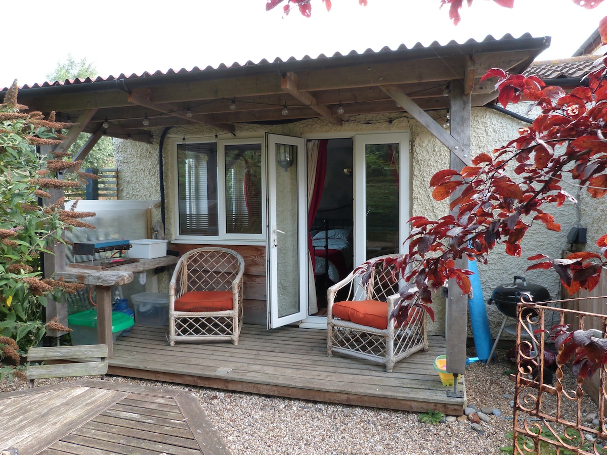 A beautiful bohemian /romantic Self contained space in our garden for two . Beautiful textiles and vibrant colours , which is reflected from my love of travel to India, Asia and the Caribbean , sunny garden space with barbecue , table and chairs for relaxing . Private access to a beautiful beach Perfect for a romantic getaway tea /coffee/ Light breakfast Evening food options MUST LOVE CATS we have pudding and Percy our beautiful exotics and Basil our adorable Havamalt