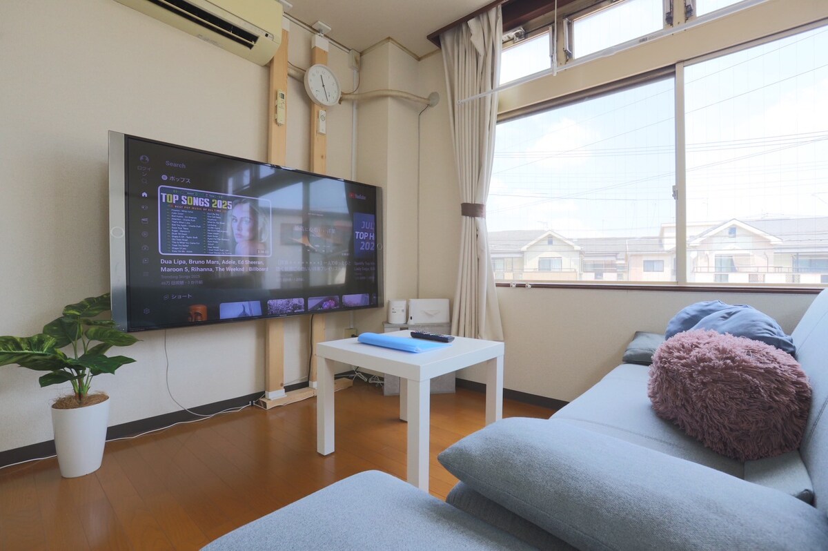 2025年5月NEW OPEN! 八幡ハイムは歴史のある埼玉県草加の住宅街にある小さなビルの2階にある宿泊施設です。41㎡でキッチンが独立し、大型TVとソファのあるリビングルームを備えた広々とした宿泊施設です。全てプライベートな空間で、まるまる貸切でご利用いただけます。 🍳施設について プライベートな寝室にはダブルベッド2台、仲間との会話が弾むリビングにはダブルベッド1台を配置しております。ソファベッドもあるため、4~6人の家族や友達グループで快適に過ごすことができます。 洗濯機含め一通り生活に必要なものが揃っています。 🛒周辺について すぐ近くに24時間営業のコンビニがあります。大型スーパーやも徒歩圏内にあり、大変便利で暮らしやすい立地です。 🚃アクセス 最寄り駅は東武スカイツリーライン新田駅。上野には直通で30分ほどで着き、秋葉原、銀座も直通で行け、観光にビジネスに便利です。 最寄り駅までは歩くと13分かかりますが、平坦な道で途中にはスーパーやパン工場直営のパン販売所もあり、便利です。