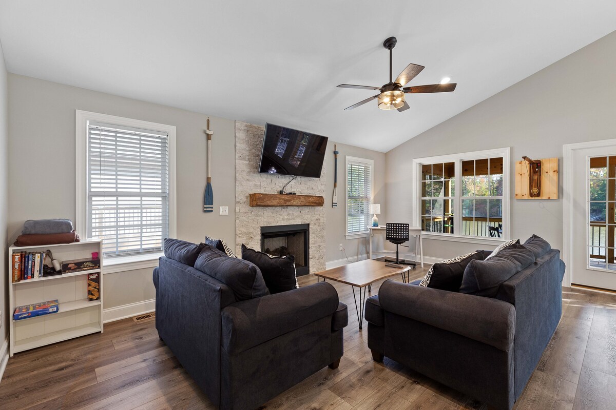 Magrelaks sa natatangi at tahimik na bakasyunang ito. Napakaliblib na lugar ng lawa na may mataas na bato sa harap ng lawa. Pribadong pier at lumulutang na pantalan. Nasa mababaw na bahagi kami ng lawa kung minsan kung ito ay sapat na tuyo o ang mga damn na bukas na pier ay maaaring nasa lupa. 95% ng oras na mayroon kaming magandang tubig. May mga camera sa labas at naka - off ang mga ito sa panahon ng iyong pamamalagi, pero kung mas komportable ka rito, iiwan namin ang blink module sa sala na puwede mong i - unplug sa panahon ng iyong pamamalagi kapag umalis ka.