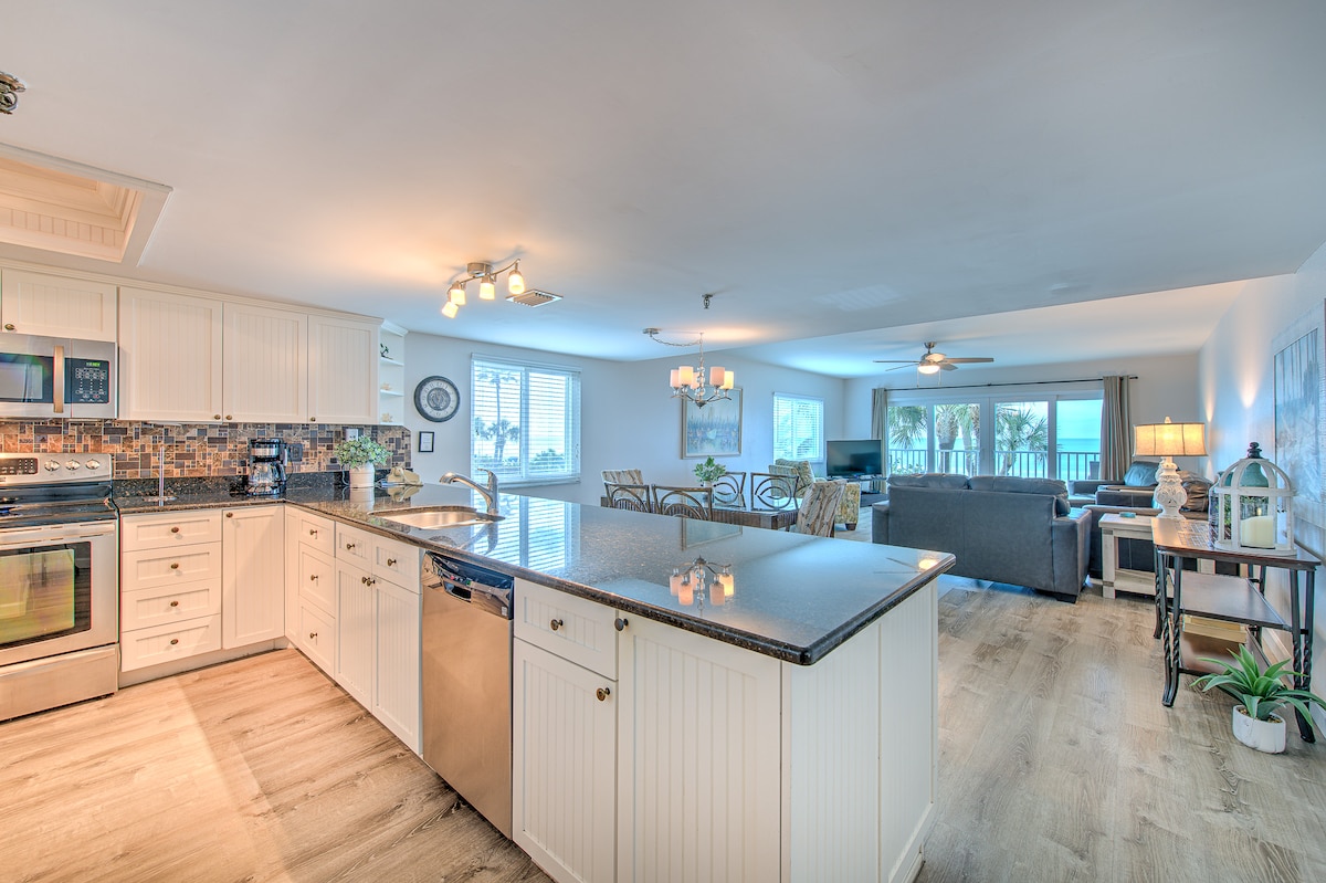Beachfront na Bakasyunan na may Balkonahe at Tanawin ng Gulpo/Pool