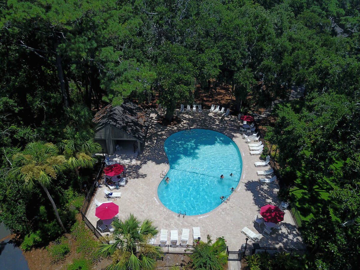 Matatagpuan sa prestihiyosong Sea Pines Resort, ang Sweet Carolina Retreat ay may mga amenidad na kinakailangan para sa perpektong bakasyon sa beach. Ang tuluyang ito ay may pambihirang kombinasyon ng maluwang na oasis sa labas kasama ang malaking bakuran sa likod na may damo para sa 2 o 4 na binti na bisita. Magrelaks sa malaking sports pool o hot tub, at magtipon kasama ng iyong mga bisita sa paligid ng fire pit o outdoor bar. Ang lahat ng ito ay maigsing distansya papunta sa beach at isang madaling biyahe sa bisikleta papunta sa Harbour Town (parola) at South Beach Marina (Salty Dog).