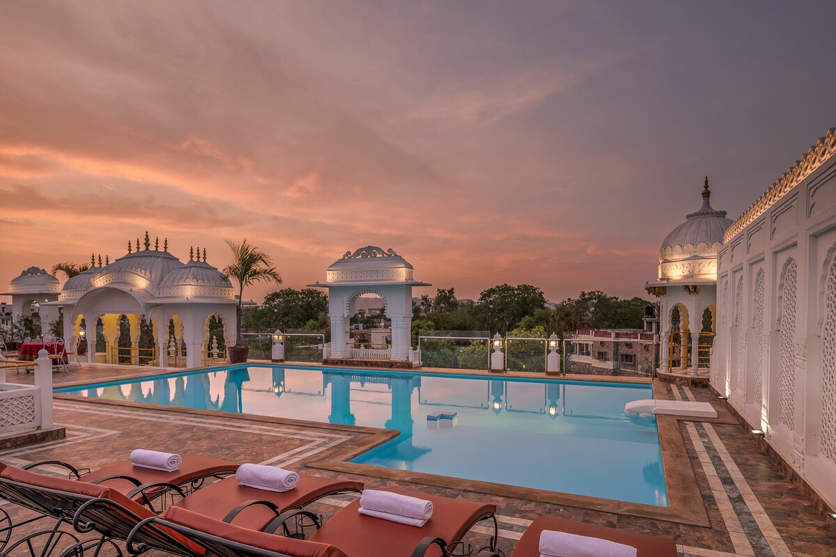 Kasaysayan ng karanasan sa Sunar Bagh, isang 300 taong gulang na haveli sa bundok na matatagpuan sa Aravali Hills ng Jaipur. Ang kamangha - manghang property na ito ay may 3 palapag ng mga eleganteng naibalik na kuwarto, ang bawat isa ay naghahalo ng tradisyonal na kagandahan na may mga modernong amenidad para sa tunay na kaginhawaan. Mag - book ng isa hanggang tatlong kuwarto para umangkop sa iyong mga pangangailangan. Magpakasawa sa masasarap na lutuin sa on - site na multi - cuisine cafe, at magpalamig nang may paglubog sa kaaya - ayang swimming pool. Nag - aalok ang Sunar Bagh ng natatanging timpla ng pamana at luho, na perpekto para sa hindi malilimutang pamamalagi.