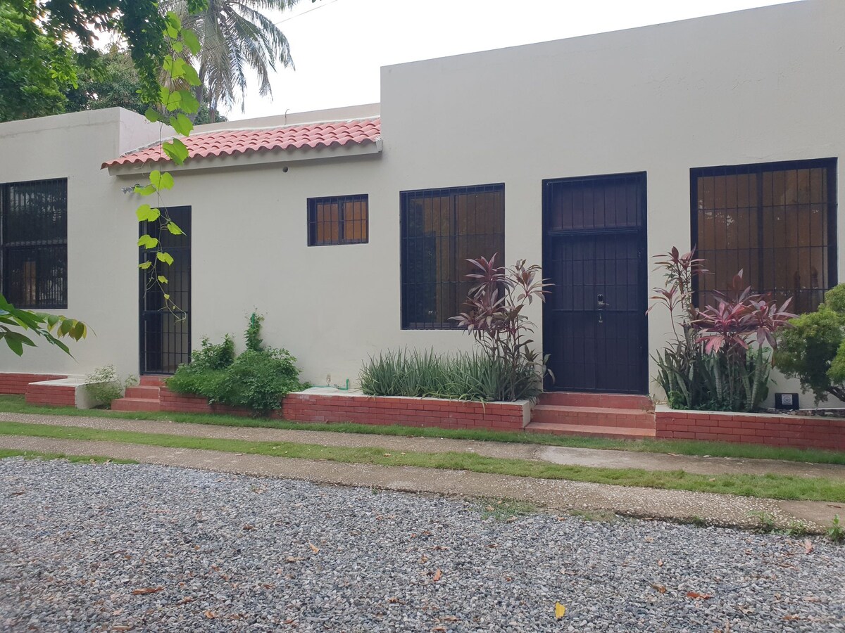 Maganda at komportableng maliit na pribadong guesthouse sa loob ng pangunahing property sa tahimik at magandang komunidad na may gate, 200 metro ang layo mula sa beach, 24/7 na seguridad, full - size na higaan, kumpletong kusina, pribadong banyo na may shower. May extender para sa wifi kaya hindi ito palaging maaasahan. Ang AC ay dagdag na gastos na 7 sa amin$ bawat gabi. WALANG TV. May aso sa property, Ella ang pangalan niya. Bawal manigarilyo sa buong property. Walang backup generator.