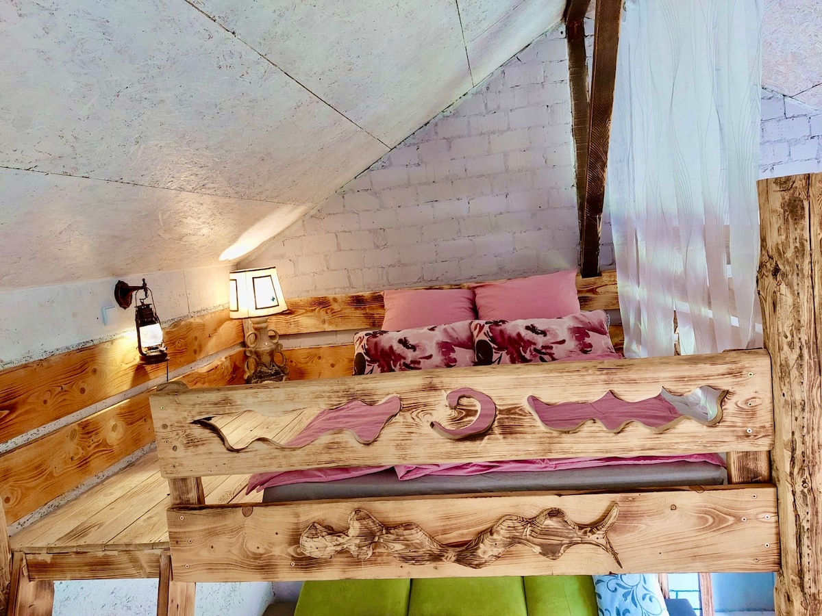 Ang trailer ng konstruksyon ay nasa tapat ng isang 100 taong gulang na kamalig na ginawa kong studio. Ang trailer ng konstruksyon ay 17 m² na may kusina - living room, double bed sa isang kuwarto. Nilagyan ang kusina ng induction cooker, kettle, maliit na refrigerator at lababo (lalagyan ng tubig). Makikita mo ang lahat ng pinggan na kailangan mo. Ang wood - burning stove ay mabilis na lumilikha ng maaliwalas na init kung sakaling kailanganin. Mga bisita - nasa kamalig ang shower at toilet.