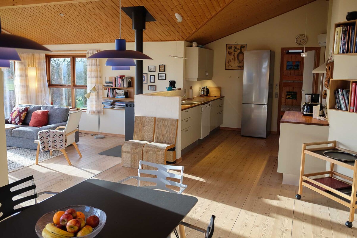 Dito maaari kang maging isa sa kalikasan sa loob at paligid ng isang maliit, naka - istilong pinalamutian na summer house ng 35 sqm. na nilagyan ng mga alcoves at loft. Ang nakapalibot sa bahay ay mga terrace na may sauna barrel, panlabas na shower, panlabas na kusina na may gas grill at pizza oven, fire pit at mga kanlungan. Nangangahulugan ito na ang summerhouse ay naaangkop tulad ng "lovest" para sa mag - asawa na gustong magsaya sa isang maginhawang kapaligiran tulad ng para sa mga kaibigan na gusto ang labas ay maaaring maging sa labas.