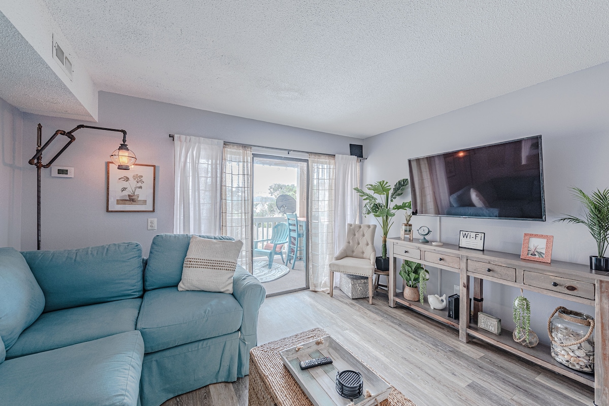 Maigsing lakad lang papunta sa beach, ang bagong ayos na 1 silid - tulugan, 1 bath condo na ito ay nasa magandang lokasyon sa isang magandang lokasyon sa isang mahusay na pinananatili na complex na may kamangha - manghang tanawin ng tubig ng Jinks Creek. Kasama sa pribadong kuwarto ang king size bed, closet, at internet TV. Komportableng natutulog ang unit na ito na may 4 na na - upgrade na gel queen mattress sa pull out sofa. Gamitin ang aming beach gear habang nagpapalipas ng buong araw sa beach at tangkilikin ang mga sunset mula sa deck.