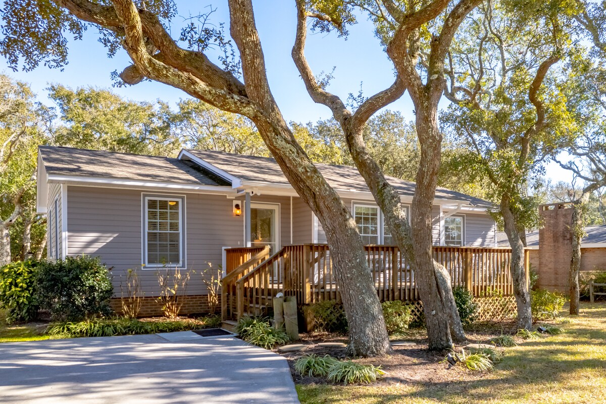 Maligayang pagdating sa The Grove! 3 minutong lakad lang papunta sa beach at malapit sa mga restawran, tindahan, ice cream, Oak Island Pier, at magandang coffee shop. Magrelaks sa mga balkonahe at sunroom na nasa lilim ng magagandang Live Oak tree pagkatapos ng isang araw ng paglalakbay sa isla. Magpaligo sa isa sa dalawang outdoor shower at magpahinga sa tabi ng firepit habang gumagawa ng mga di‑malilimutang alaala. Mag-book na sa The Grove!