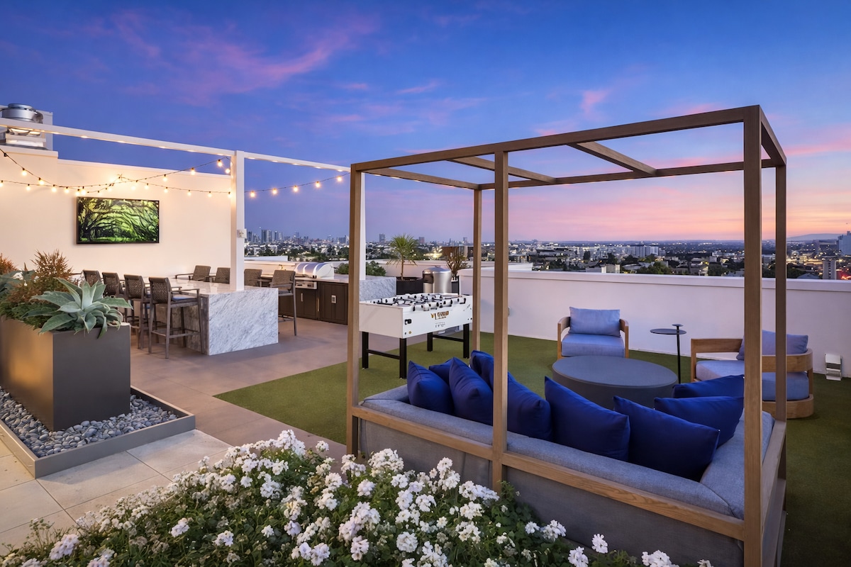 Bright studio in the heart of West Hollywood with panoramic windows and a balcony open hills/mountain views — perfect for morning coffee or sunset. Modern finishes create a light, airy feel, and the open-concept layout makes the space feel larger. Enjoy a sparkling pool with loungers, a fully equipped gym, and 2 FREE secure underground parking spots (rare in WeHo). Grocery store across the street, and you’re steps from trendy cafes, boutiques, and nightlife. Ideal for work + leisure in LA.