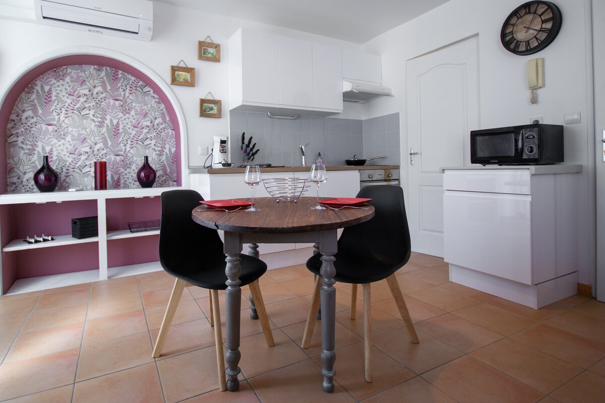 Le Petit Soleil, isang tunay na love nest sa gitna ng kabisera ng Minervois, eleganteng at sentrong tuluyan, lahat ng tindahan ay nasa loob ng 5 minutong lakad, libreng paradahan. Halika at mag‑enjoy sa maliwanag na studio na ito na inayos noong 2023, may air‑con, at double glazed carpentry, Maayos na dekorasyon "Glamour" na kusina, lugar ng kainan, lugar ng trabaho, wifi. Para pumunta at tumuklas bilang mag‑asawa nang dalawang gabi o higit pa sa katapusan ng linggo, kasama ang mga mamahaling serbisyo at linen sa higaan sa bayarin sa paglilinis.