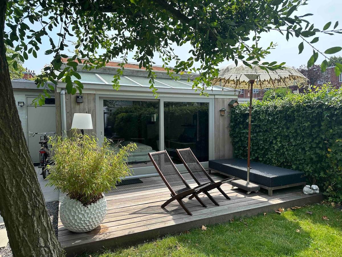 Romantic garden house (27m2) in a green garden, with kitchen block and bathroom with shower and toilet, in peaceful late 19th century neighbourhoud on the edge of the medieval city center; ten-minute walk to the city centre. Full privacy, independently accessible.