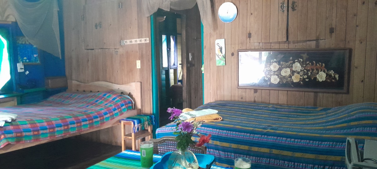 Ang aming Maliit na Cabana (10x14) ay halos 60ft ang layo mula sa Caribbean Sea. Isang maaliwalas na opsyon sa badyet na may double bed, pribadong banyo/hot shower, maliit na refrigerator, coffee maker, bentilador. Sa gitna ng lokal na buhay - mga batang naglalaro sa dagat, mga mangingisda na naglilinis ng huli ng araw, mga aso at manok na tumatakbo sa paligid. Tangkilikin ang malamig na simoy ng hangin habang nagbabantay para sa Manatees, lumangoy o magpalamig gamit ang masarap na inumin sa bar sa ibaba - ilang talampakan lang ang layo ng pagkain at inumin...