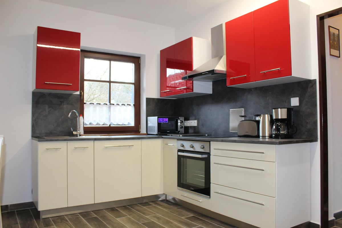 Ang buong apartment ay para sa iyo lamang. May 2 kama sa kuwarto, 2 kama sa folding bed na may magandang mattresses. Maaari mong i-enjoy ang malaking terrace na may seating area. Ang aming pamilya ay nakatira sa ground floor, may isa pang apartment sa attic na katabi ng apartment. Pinahahalagahan ng mga bisita ang tanawin ng pond, paglalakad o pagbibisikleta sa kalapit na kagubatan, o ang posibilidad na bisitahin ang mga kalapit na atraksyong pangkultura. Ang bahay ay nasa isang nayon malapit sa Jindřichův Hradec. Magiging komportable ka, kung ikaw ay naglalakbay o nais manatili sa loob ng ilang araw.