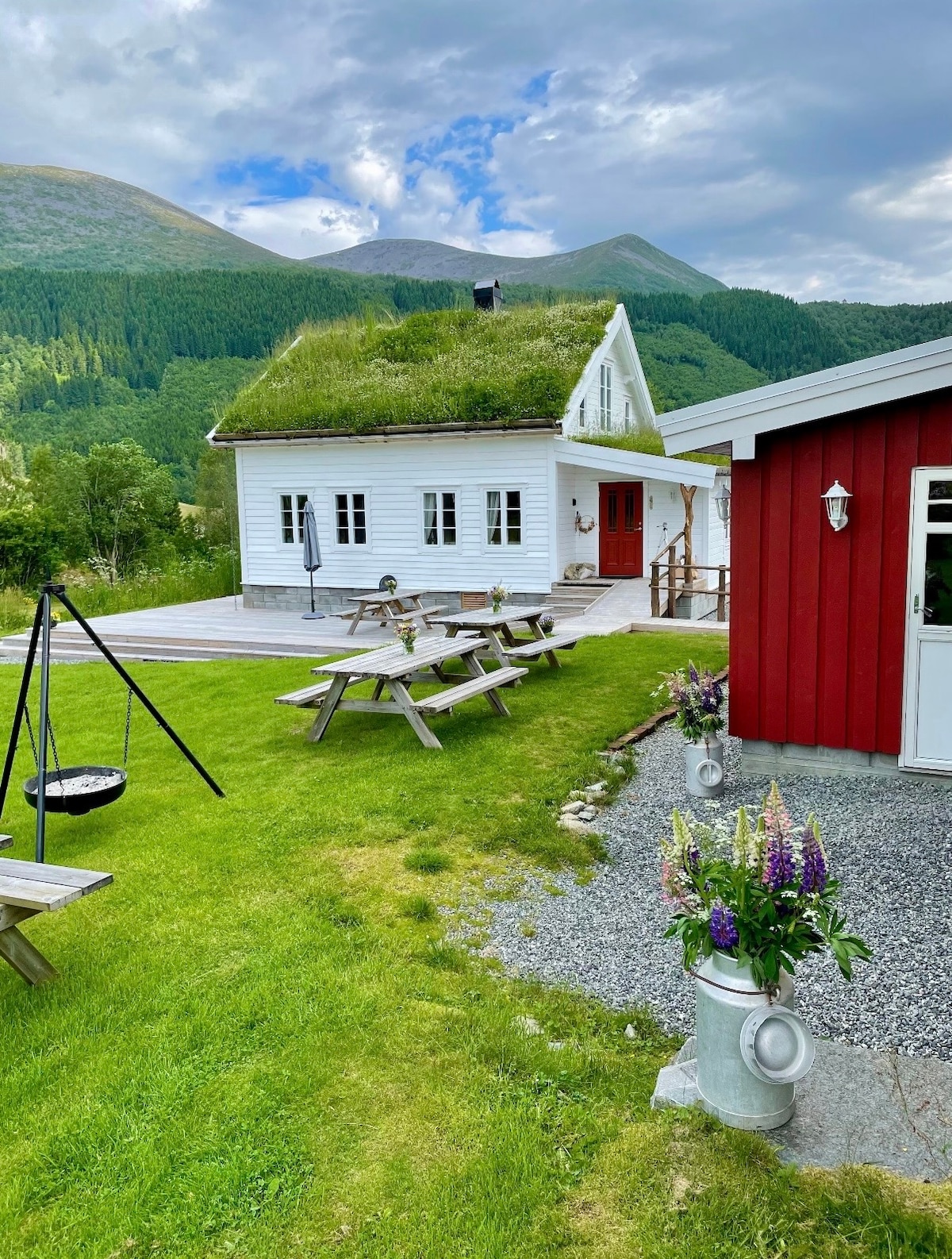 Guesthouse na may tatlong kuwarto, dalawang sala, at kapasidad na hanggang 12 bisita. May kumpletong kusina, dining area, fireplace, at Wi‑Fi sa bahay. Loft sala na may TV. Sa labas, may malawak na terrace, hot tub, lugar para sa pag-ihaw, malaking bakuran, trampoline, at magagandang tanawin. Perpekto para sa mga pamilya at grupo sa buong taon. Washing machine (NOK 100 kada load). NOK 200 kada charge ang singil sa pag-charge ng de-kuryenteng sasakyan.