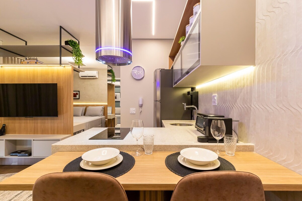 Studio moderno, luxuoso ,de 47m², localizado em condomínio residencial à Rua Duque de Caxias, 880, a passos de distância do Cambuí. Próximo a bares, restaurantes, supermercados, cafés e muito mais. Lindamente decorado e equipado, cama tamanho queen, closet, água quente em todas as torneiras, cafeteria Nespresso, 2 aparelhos de ar condicionado, TV 50" giratória (acesso da sala e quarto), ducha higiênica no banheiro e estação de trabalho para duas pessoas. Condomínio com lazer incrível.
